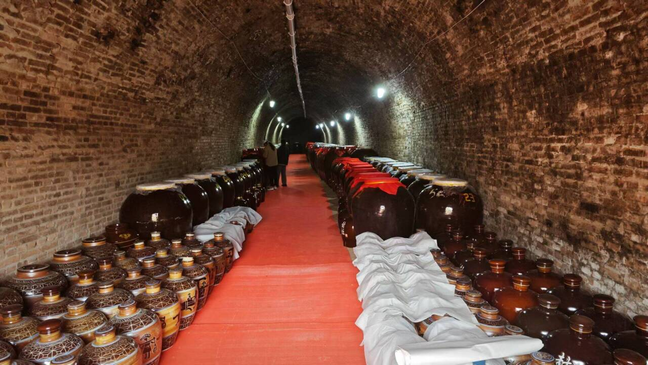 ,一排排陶瓷坛随着时间的老熟,自然陈香扑鼻而来。百米深的黄土洞用于白酒的存放,除此以外,还有一部分90年代老酒存放在用特殊材料制作的酒海中。